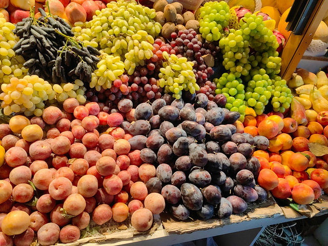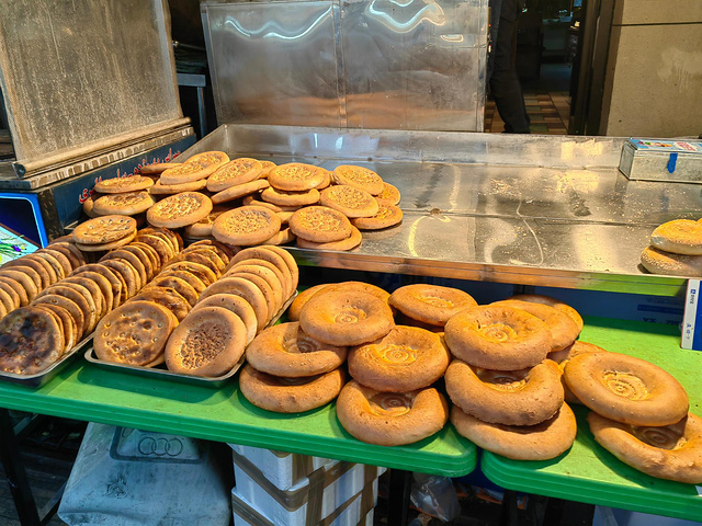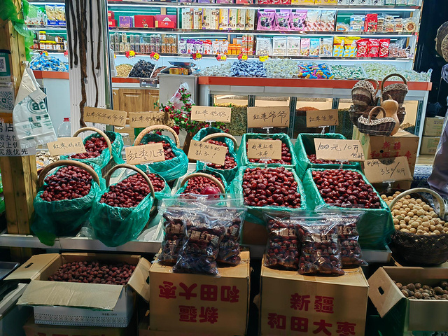 将近8点,正是当地晚餐时分,我与同伴准备在这里逛吃。各式水果看上去都很好吃。各种馕也十分诱人。新疆的小麦粉筋度特别高,别的地方恐怕无法复制一样的馕。和田枣一大家子。手抓饭和缸子肉,那是重头戏。来自游记北疆秋色九天八晚