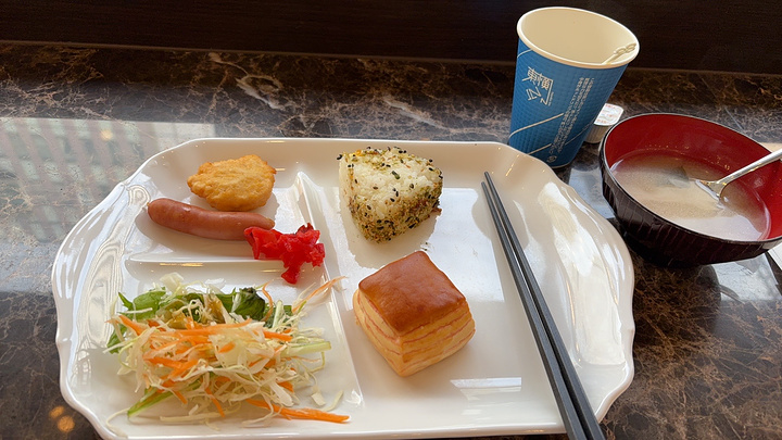 早餐:汤、咖啡、饭团、简单的面包、沙拉,香肠,差不多就这些,不丰富但是能吃饱,毕竟价格在那摆着呢。
