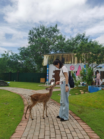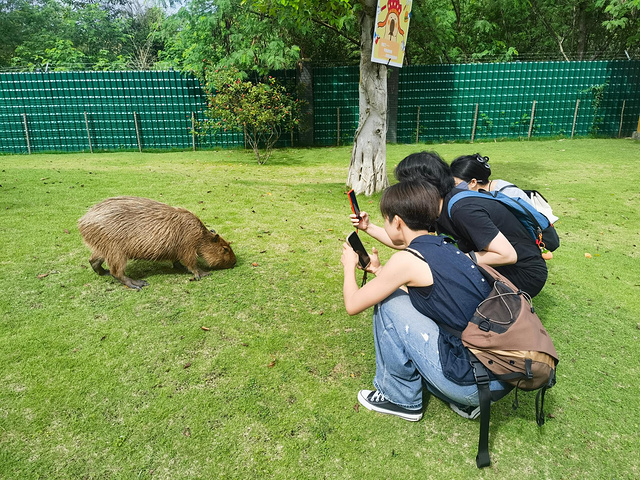第三站是卡鹿里萌宠乐园(鹿苑)。除了温顺的小鹿和小羊,这里还有“明星动物”卡皮巴拉。门口10元一袋的胡萝卜刚掏出来,几只小鹿就围拢过来,可爱极了。卡皮巴拉,学名水豚,原产于南美洲,是一种以草和水生植物为食的大型啮齿动物。它四肢短短、身材圆滚,表情呆萌,动作慢吞吞,性格却出奇温顺。我们不仅能近距离观察,还能轻轻摸一摸,那份憨态可掬让人忍不住想多观察一会儿。