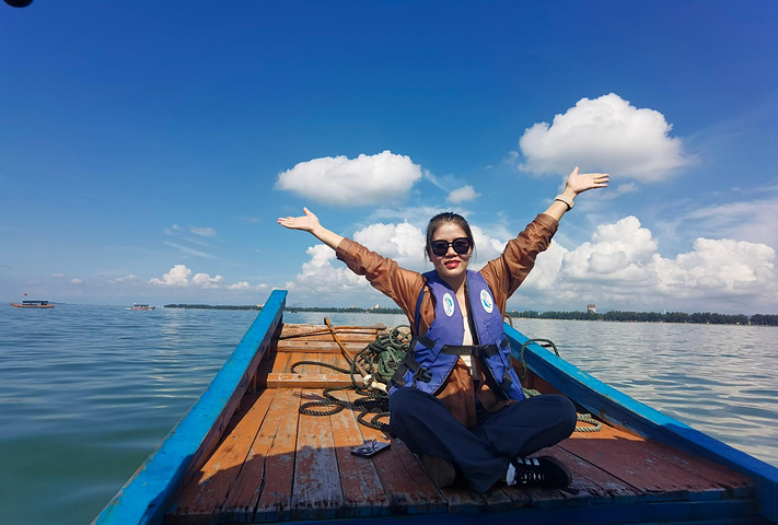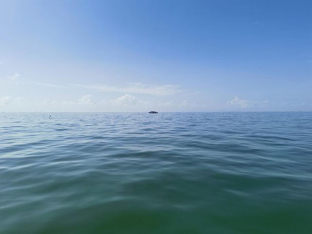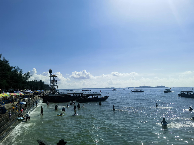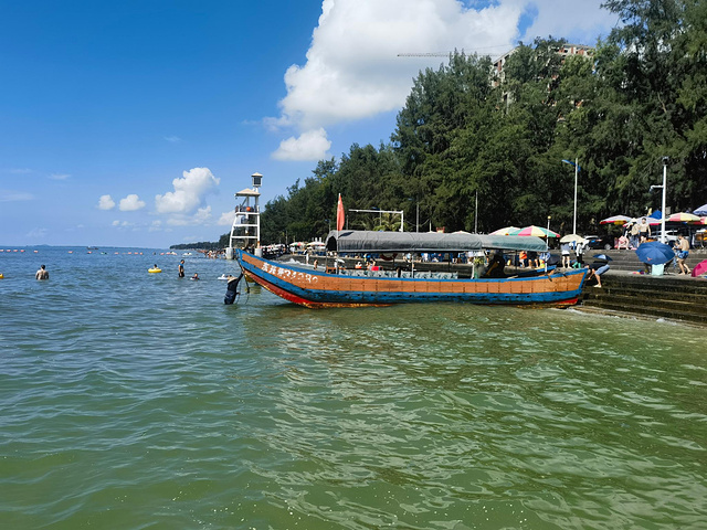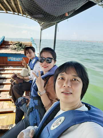 万尾金滩是东兴著名景点之一,尤其以日落美景闻名。我们搭乘18路公交直达海滩入口,刚寄存好行李,就有一位热情的大姐上前招呼问我们要不要坐船出海,一问价格,只要20元/人,可乘半小时;若包船还能出海捕鱼,价格也相当实惠。不过我们人少,捕上来的渔货还得找地方加工,略显麻烦,便决定简单体验一下海上观光就好。等了一会儿,船上凑够了5位游客,老板便启航出发。