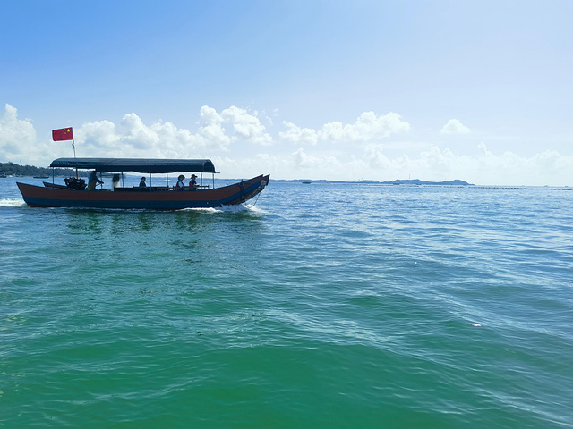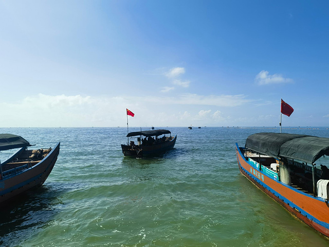 那天海面风浪不小,开船前老板甚至得站在齐膝深的海水里,牢牢扶住晃动的跳板,帮大家安全登船。这片海域水色深邃幽蓝,阳光洒在波面上泛着细碎金光,经历了台风过境,还能看到如此清澈的海水,已让我们心怀感激。