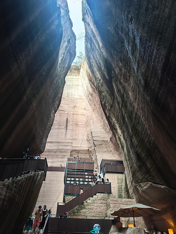 听老板说,岩宕书屋是网红打卡地,五点半就关门。所以从倪翁洞出来后,步履匆匆,直奔岩宕书屋。走了大概15分钟,5点钟左右才来到岩宕书屋。岩宕书屋的前身是一家书院,现在改为书屋。一进去,就被岩宕书屋的独特所吸引。颠覆了我对网红打卡地约等于过度包装、平平无奇等等的认知。两边耸立着巨大的岩壁,阳光从岩壁中间的缝隙洒下来,人站在其中,感觉非常的渺小。沿着楼梯,慢慢向上,走到书屋的最上面,向下俯看,惊叹大自然的鬼斧神工,也不禁感叹古人学习条件的艰苦。