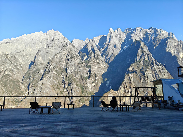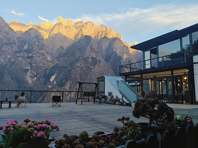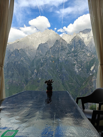 刚走进餐厅,就闻到飘来的焦香 —— 已经有客人吃着烧鸡,金黄的外皮泛着油光,有人用筷子撕开鸡腿,肉汁顺着指尖滴下来,还不忘用粤语喊 “趁热食!皮好脆!”。大阳台上倒很清净,几位客人举着手机拍雪山,镜头都对着玉龙雪山的全貌,偶尔传来几句 “这里角度好,拍给朋友看肯定羡慕” 的交流。老板帮我们安排好房间,我们订的是阳台下的房间,拉开窗帘的瞬间我惊了 ——2 米宽的全景窗正对着雪山,白云像贴在雪山顶上,赶紧拍了张照发给广州的朋友,没过几秒就收到 “哇!这视野绝了,烧鸡好吃的话记得上图!” 的回复。