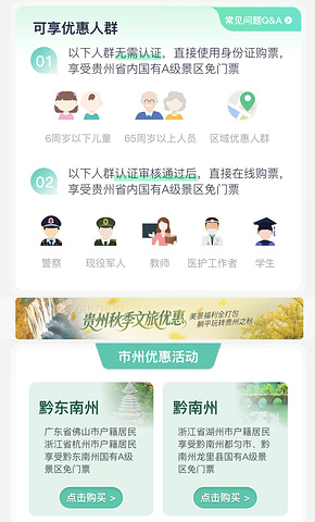 wx搜索一码游贵州小程序,有全省景区介绍、购票入口和优惠详情,还有一些特色美食推荐。