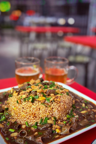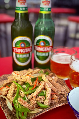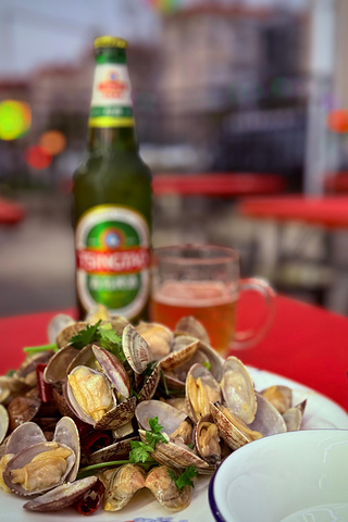 心萍啤酒屋:离我们这次住宿仅有3站公交车的距离,启先也是被up主种草,可能由于当天落地后有点饿,早早的(17点)来到店内点餐,还没有到饭点当然食客不多,老板建议我们坐在室外就餐,借此机会可以让我安安静静的点餐,不一会儿点了5道菜+2瓶 青岛 啤酒(海肠捞饭,蒜蓉生蚝,什锦时蔬,葱爆花蛤,锅包肉),但是被老板无情的打断了我对锅包肉的执念,当一道道菜上桌时,顿时明白了老板为何要让我断了这个念头,因为每份菜的量都非常大,而我们就2个女生,最后海肠捞饭每个人才扒了一口,实在吃不下,并且吃饱喝足后,为了消食,我们只能以散步方式走回酒店,当我们离开时,店堂内/堂外已座无虚席,不愧是老店