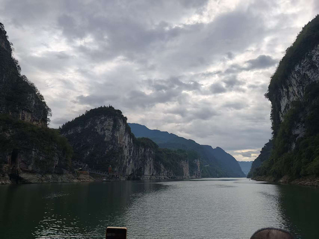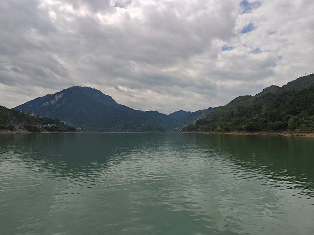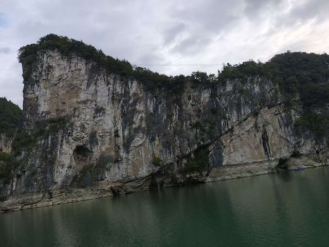 登船后,在二层船尾寻着几把塑料凳,岳母坐下来,让江风拂着鬓角的白发;我和妻子、女儿进了船舱,凭窗望着江水。游船刚驶离码头,乌江的画就缓缓展开了:山是被斧凿过的青灰,崖壁上的绿树像攥着石缝生长,随船行换着模样 —— 方才还是横亘的绿屏障,转过弯就成了拔尖的石尖峰,偶尔有几丛野花从树影里探出头,给青灰添了点粉白;水是碧得像被江水反复摩挲的老翡翠,水面下藏着朦胧的暗绿,看不见水底的石,却透着润。它有时顺着山势铺成平直的线,一直连到青山缝里的天,像江水和天空接了吻;有时又在山湾处静成湖,把叠翠的峰峦全映在水里,连云影都跟着晃。