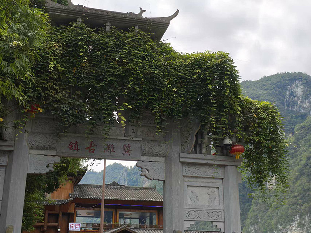 跟着人流往右走,先撞见几棵开得艳的花树,花瓣落在青石板上,成了天然的笺纸,我们踩着花瓣走,倒像走在诗里。再往前是座灰砖黛瓦的石门楼,“龚滩古镇” 四个字是隶书,刻在门楣上,砖缝里爬着青藤,连剥落的漆都透着岁月的软。