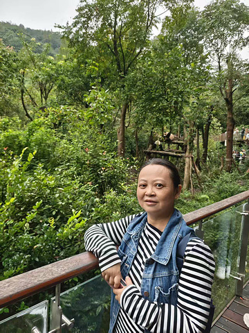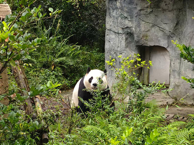 在谷口 “熊猫谷” 的石牌前拍了合影,跟着人流往里走。第一个观览点围着三十多人,都静着举着手机,顺着目光望过去:一只大熊猫正捧着竹子啃,黑毛沾着竹屑,啃两口就慢悠悠转个圈,圆身子蹭得竹影晃,憨得让人忍不住笑。我站在后排拍不清,瞥见栅栏另一侧没人,轻手轻脚绕过去,刚站定,大熊猫就从竹影里钻出来,赶紧拍了照、录了视频发家庭群,没一会儿就收到满屏 “好萌”。