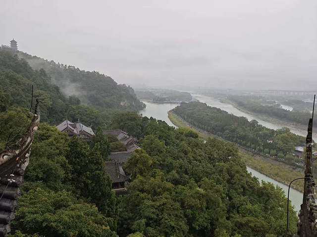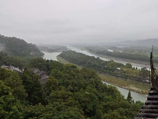 刚上秦堰楼二层,眼前的景就撞得人说不出话:鱼嘴把岷江稳稳分成内江和外江,碧绿的江水顺着河道奔涌,像条翡翠带子;岸边的古柏遮天蔽日,树干粗得要两人合抱;远处的青山连绵,雾还没散,像给山裹了层纱。两千多年前,李冰凿的石堤还在分水,江水奔涌的声里,全是古人把 “水患” 调成 “水利” 的智慧。附近导游的讲解声飘过来:“深淘滩,低作堰,这口诀传了两千年……”