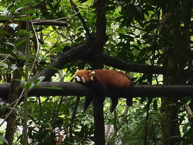 逛到小熊猫区时,岳母嫌山坡陡,在山下歇着,我和妻子、女儿往上爬。刚到观览点,就见着只棕红色的小熊猫在山坡上跑,细长的尾巴晃来晃去,像团会动的绒球;还有一只躲在树杈上抱树枝,爪子勾着树皮;最静的一只趴在树干上,眯着眼睛晒太阳。旁边导游的声音飘过来:“小熊猫是小熊猫科,跟大熊猫不是亲戚,尾巴上有环纹,特别好认……” 。