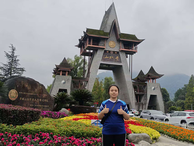 先在游客中心和青城山大门前拍了打卡照,按着指引往前走,可走了五六百米也没见电瓶车,只看见对面马路的车满载游客飞驰。问路边保安,说 “往前 500 米对向站点能等车”。拖着发沉的腿走了十分钟,到了站点才知,这里不是始发站,每辆来的电瓶车都挤得关不上门,根本登不了车。