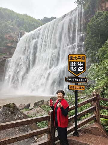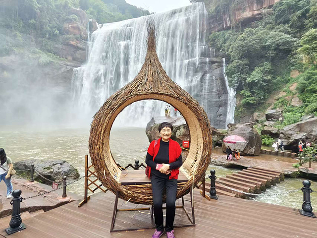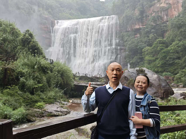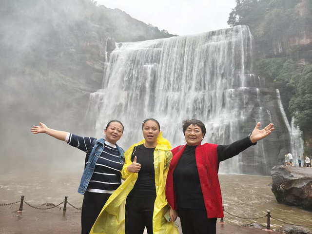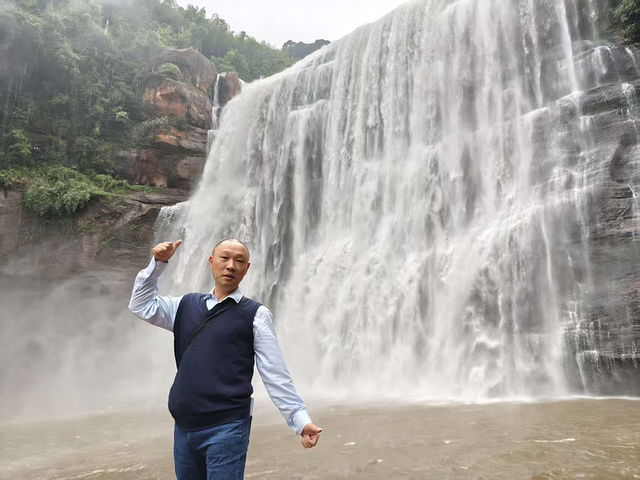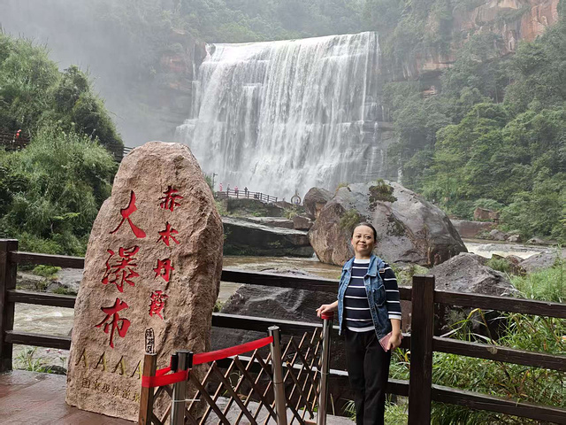 我们找了几处观景台拍照,从正面拍瀑布的全貌,水砸在潭里的声像在耳边;从侧面拍水雾里的彩虹,颜色鲜得像能摘下来;还录了段视频发朋友圈,想把这份鲜活,分享给没到的人。“赤水丹霞大瀑布 AAAAA”“此生必达” 的打卡牌前,大家轮流站定,岳母笑着说:“这瀑布比照片里还活,连风里都带着水的甜。” 微风裹着水雾拂在脸上,凉丝丝的,连头发丝都沾了潮气,浑身的疲惫都散了。