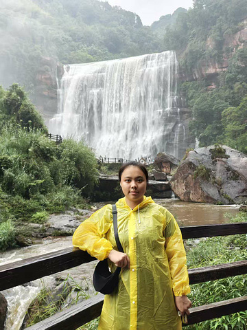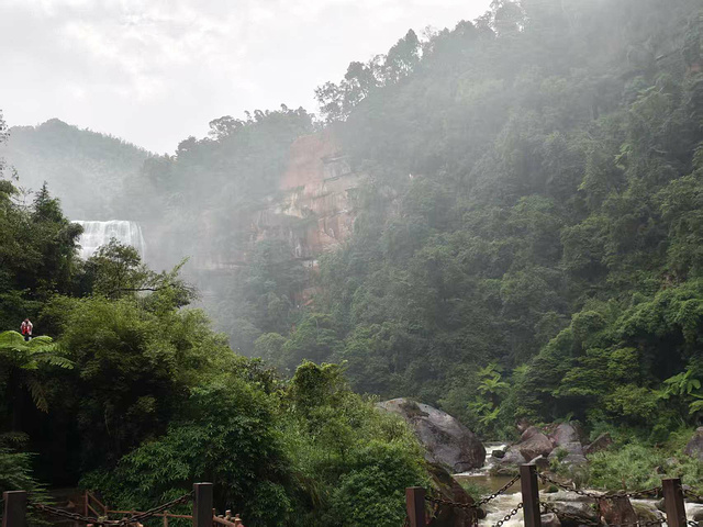 出了隧道,跟着指路牌往瀑布走,10 多分钟就到了第一个观览点 —— 只听见 “哗哗” 的水声从山里传出来,像谁藏在崖后唱歌,却看不见瀑布的影子。再往前走几步,瀑布慢慢 “露脸”:先是半遮半掩在山脚后,像害羞的姑娘只露一角;再往前拐个弯,整座瀑布突然展开 —— 水流从几十米高的红色崖顶砸下来,溅起的水雾在阳光下扯出彩虹,像给瀑布系了条彩绸;下方的深潭绿得像被染透的翡翠,红崖映着碧水,热烈又灵动,看得人忍不住惊叹,连呼吸都轻了。