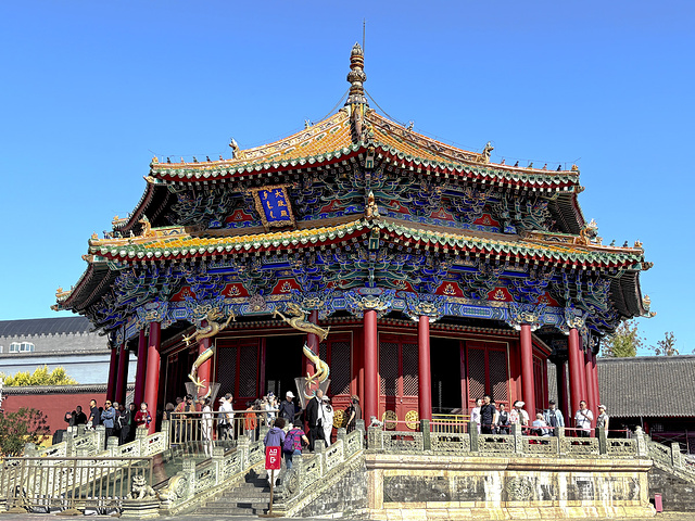 先参观东路,是努尔哈赤营建的重要宫殿,始建于1625年。大政殿猛一看就是个华丽的大亭子,八角重檐攒尖式殿前的两根大柱上雕刻着两条蟠龙,气势雄伟。