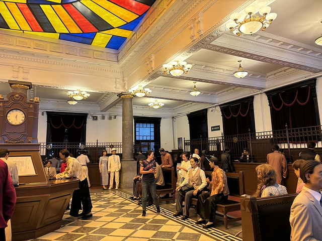 最后还有一个什么金融中心,也在套票里面,很累想找个地方坐会,瞥见里面有坐椅,可进去一看一个类似银行的大堂全是真人大小的蜡人,坐在椅子上的也是他们,空地儿上有标志游人不能坐。想退出大门已不能够,只能沿参观路线上上下下地走完全程才能在出口出。就好像没骗进来的一样,本就很累了又多走了这许多路。1:00多结束游览,烈日下出了一身小汗。