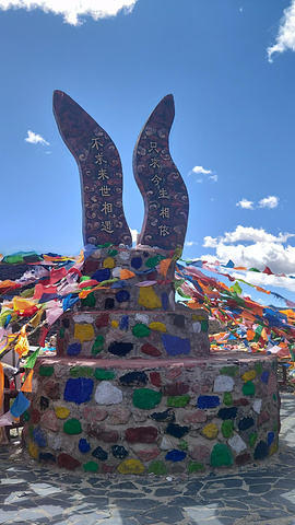 然后出发往理塘,大概11点左右到达理塘长青春科尔寺(后来才知道这里就是“勒通古镇”了,就是丁真珍珠工作的地方,根本都不知道好吧,或许是怕我们逛得太久,耽误了下午的行程?但是宣传页面上给我们1个小时在这里游玩的),师傅让我们在旁边的山头经幡旁边拍照、撒隆达,然后可以远眺一下海子山。收了我们35元的“理塘千户藏寨摆渡费”,可能就是从国道到科尔寺的来回3.2公里车程的摆渡费吧,这路况其实也挺好的,就是有点窄。