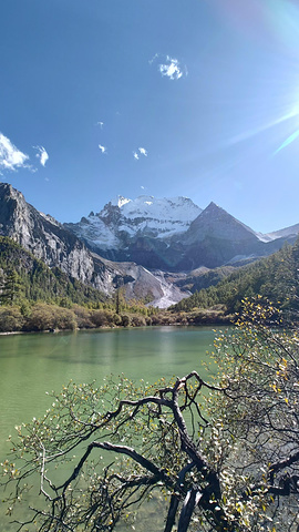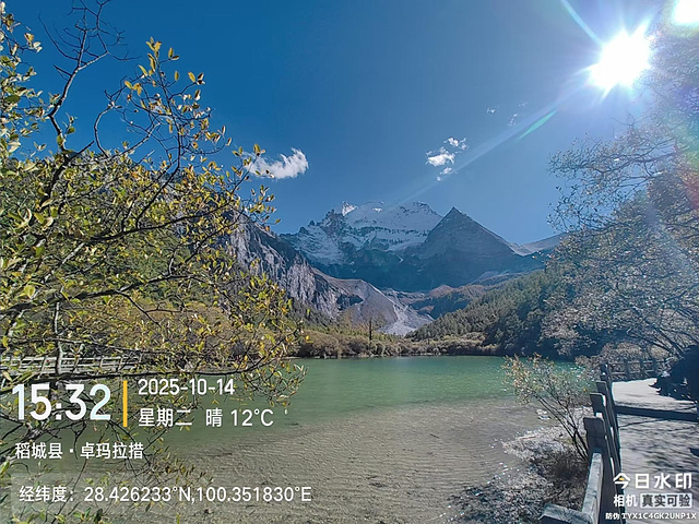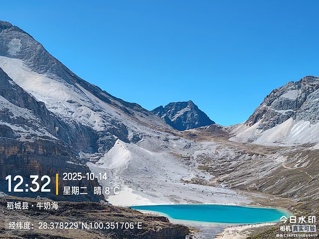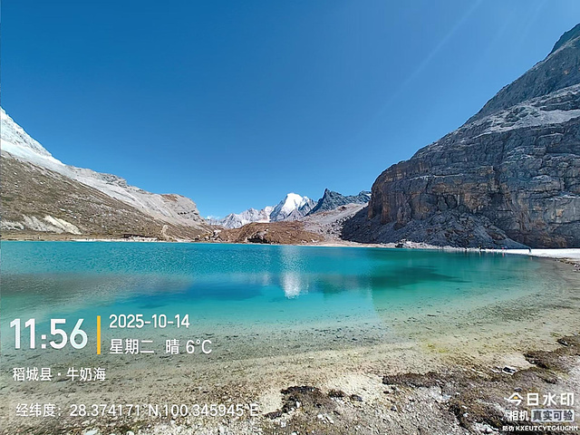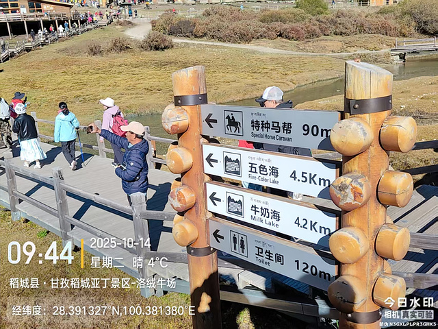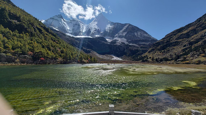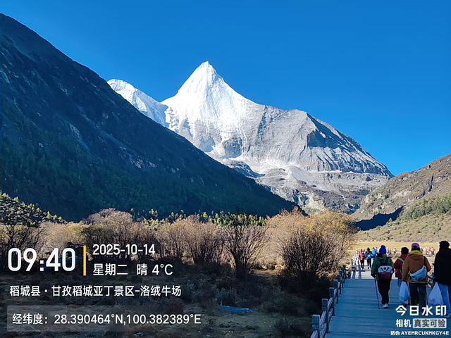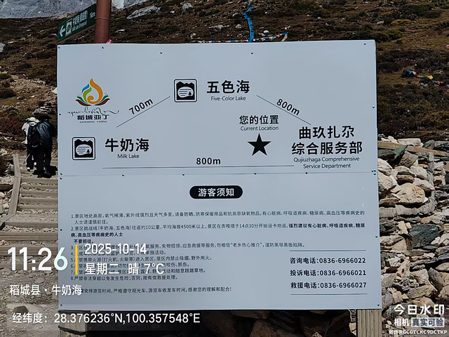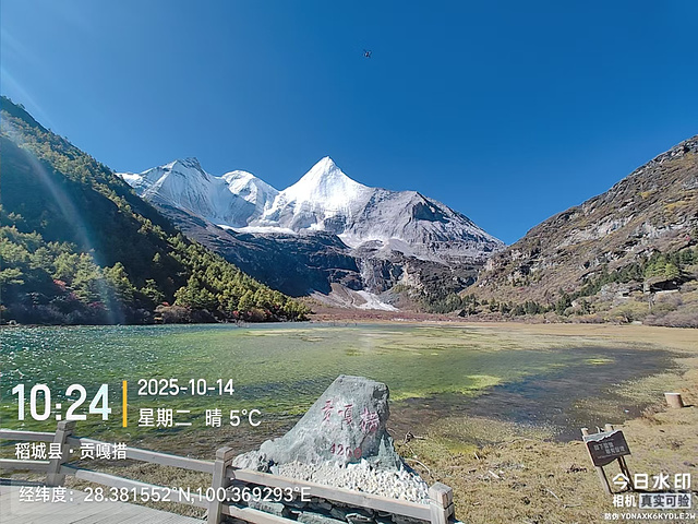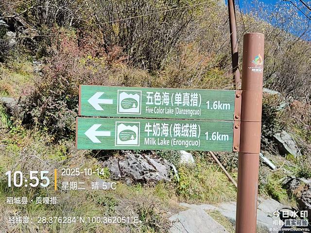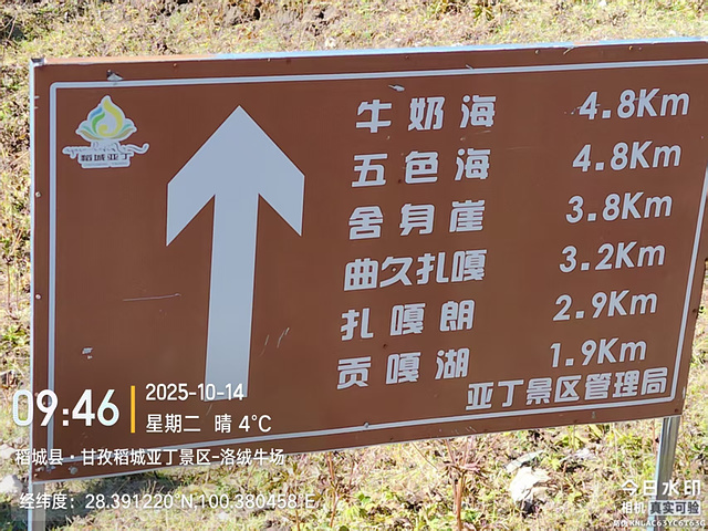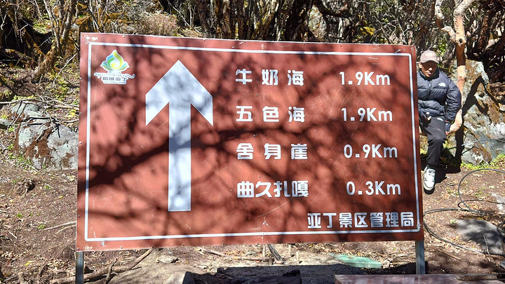 然后就分道扬镳,我快步出发了。到了冲古寺(海拔3900),我排队买了往返洛绒奶场的电瓶车票(单程40元,往返70元),上了车,9:40到洛绒奶场(海拔4180),下了观光车,有个指示牌“五色海4.5KM、牛奶海4.2KM”,上完卫生间下来,又有个指示牌往左“五色海4.9KM、牛奶海4.6KM”,看了第一个指示牌方向的路线近一些,我就没按指示牌的方向走,因为前面指示牌方向的路线短一些,而且还有阳光,没那么冷。快走几百米,到了亚丁5号驿站,这里也有制氧机出租,也有马帮可以骑马到舍身崖,价格为300元单人单程,路标显示“牛奶海、五色海4.8KM,贡嘎湖1.9KM”(这些路标也真是,让人好迷惑)。一路快走,边走边拍,随便拍,风景都很好。到了贡嘎措,前面头尖尖、两边像翅膀的就是央迈勇雪山了。然后到了扎嘎朗,从这里开始就有“背人团”招揽客人了,好像是背到舍身崖200元,背到曲久扎尕综合服务部400元,也有单纯背行李的,可能价格便宜一些吧。一路往上,到了舍身崖,有个平台,可以坐着休息,在这里歇了歇,吃了块小面包,补充点水分。接下来就是约800米的陡坡到曲久扎尕服务部,这里往上就要量力而行了。