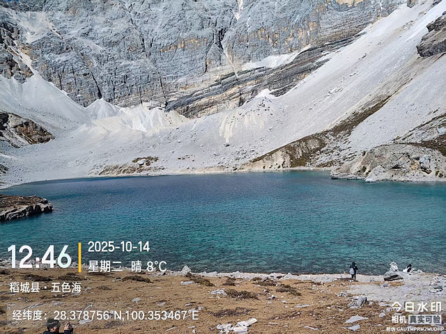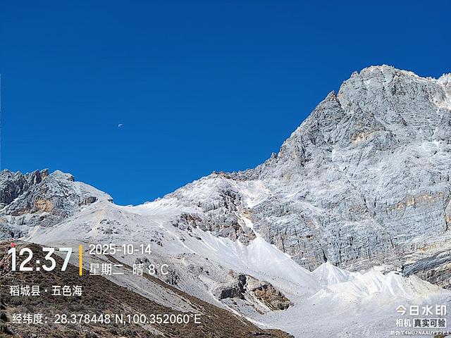 往五色海的路上,回头远拍了几张牛奶海的照片,还是从高处拍更漂亮,回去后一定要整部无人机,可以少走不少路,还能拍到更漂亮的照片,嘿嘿。途中,看到一位大哥,每一段防护铁链都要扯一下,我问他是不是在检查,他说是的。亚丁的游客安全防护工作还是做得蛮好的,点赞哦。到五色海(海拔4700),气温8度。看到了猛烈阳光下的一轮残月。