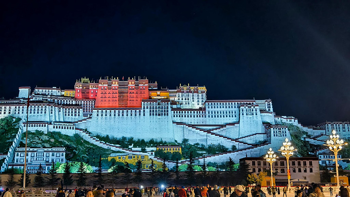 在无边墨色的夜空背景下,布达拉宫被灯光精准地雕刻出来,通体散发着温润而恢弘的金光