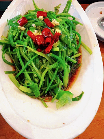 炝板水性杨花所谓的水性杨花,据说是泸沽湖上的海菜花。这道菜感觉吃的是口感,吃起来脆嫩。调味的话,基本就是更淡一些的白灼菜心。