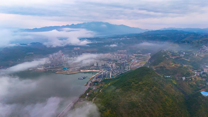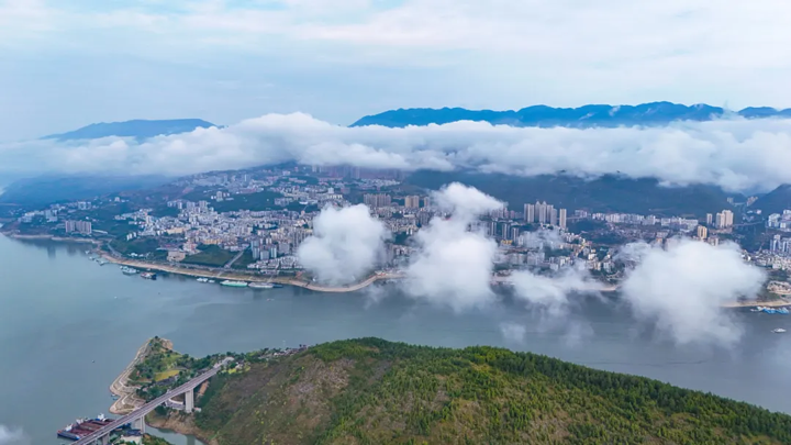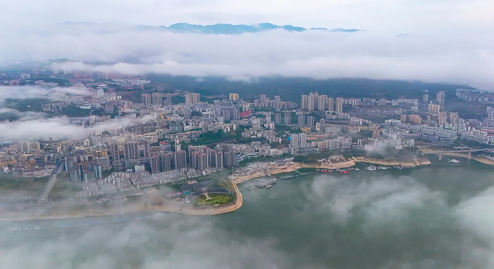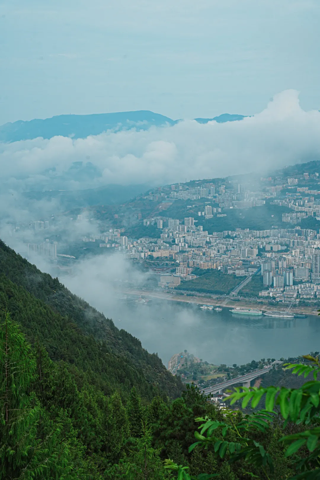 这里青山相待,白云相爱,薄雾从江面起舞,直至迷醉整座县城。