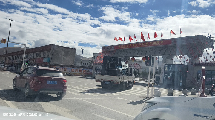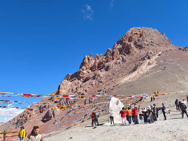 红色的岩体陡峭突兀,五彩的经幡在大风中飞扬。