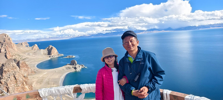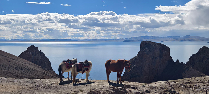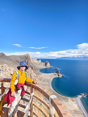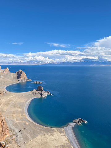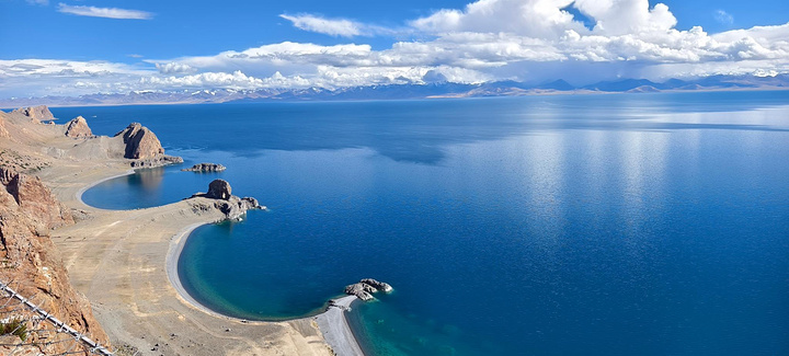 站在观景台上,居高临下,纳木错的湛蓝湖面作为巨幅画布,环绕着两个月牙形的湖湾。