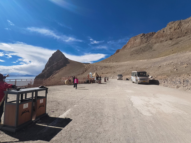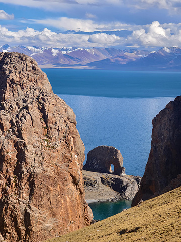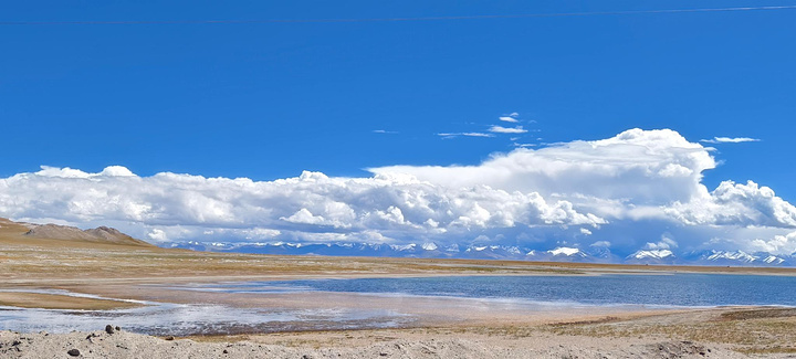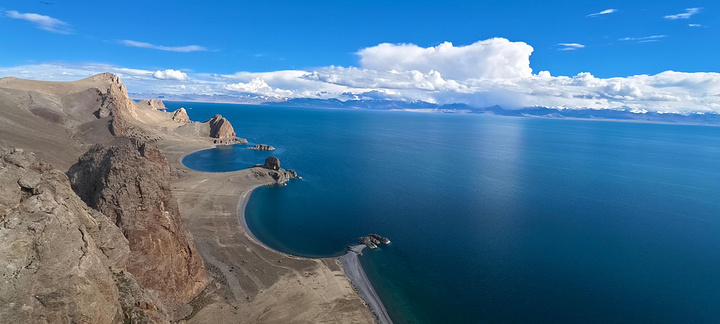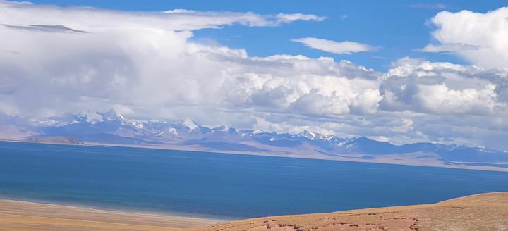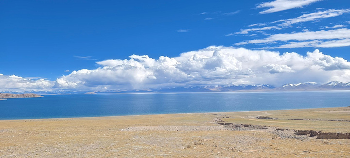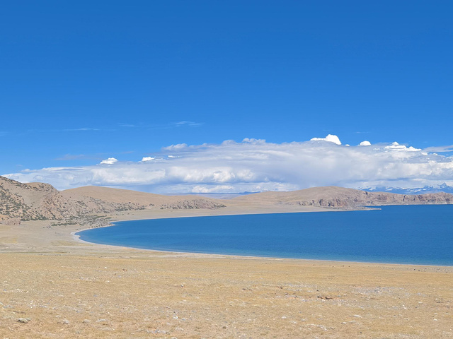 这抹广阔的蓝色,与岸边赭黄色的荒原、山巅纯白的积雪以及天空棉絮般的云朵,共同构成了一场恢宏的色彩交响。