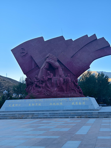 用毛石砌筑而成的纪念墙体长106米,沿大地水平展开的收分体量显得十分厚重,既有强烈的纪念性又传递出浓郁的藏族特色。