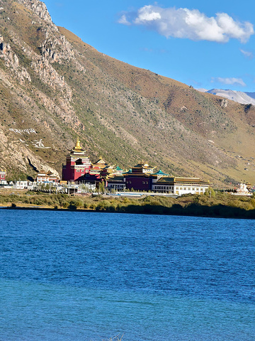 深浅不一的河水和远处静立的古寺勾构成了一幅完美的画卷。