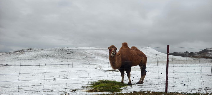 一只骆驼在凝视,这个天生的沙漠过客与雪景构成奇特的对比。