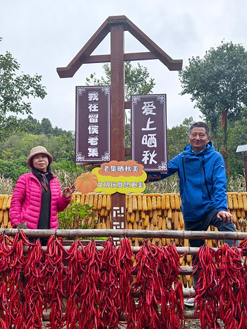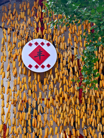 金黄的玉米棒子被巧手编成巨大的飞龙,沿着古朴得围墙蜿蜒盘踞,龙身起伏的动势,仿佛正欲借墙为云,腾空而起。