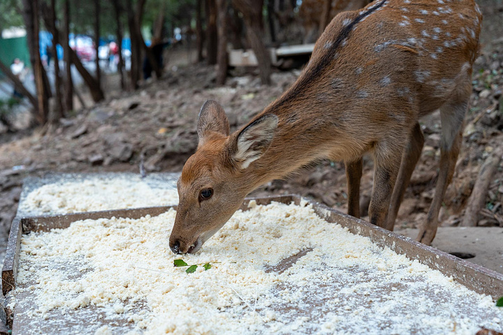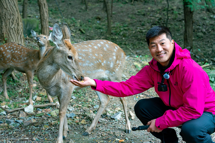 “这里的鹿都习惯游客了,每天来喂的人多,它们知道咱们没有恶意。” 旁边一位提着竹篮的阿姨笑着说,“里面还有两个投喂点,人少,你们可以去那边拍,光线更好。” 我们跟着阿姨的指引往里走,果然在树林深处又遇到几群鹿,有的在啃树叶,有的在低头喝水,阳光洒在它们的斑点上,随手一拍都是治愈系画面。
