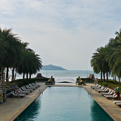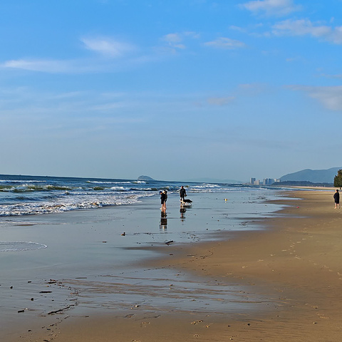 小区南门外是一条沿海小公路,路很窄,路的斜对面是一个很大的度假酒店,酒店东西将近一公里,坐拥一片广阔的沙滩。从小区大门出去,沿着步行道向右走,约莫走个三四百米便到了酒店的大门口,走进大门,穿过酒店的建筑群和草地便来到了海边。