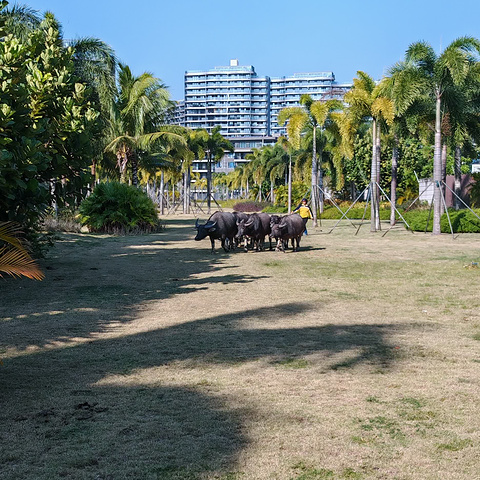 这里的草坪和北方的草坪有较大区别,草的种类是不同的。这种草不深,但是很厚实很平整,把地面覆盖得严严实实。前天天气晴朗的时候,我从草坪上走过,脚踩在草地上软绵绵的,感觉非常舒服。茂密的椰树遮住了头上的阳光,草地上投下一片片树荫。我正想坐在树荫下休息一会儿,椰林里突然闯出一群水牛。一头头黑水牛体型健硕,头上顶着弯弯的牛角,向我站立的方向跑来,我吓得赶紧躲在一边。后面两个妇女在不停地吆喝着牛群,她们显然知道这里不是放牛的地方,想赶快把牛群赶出这片草坪。这个地方并不是城市,只是在海边开发的一片住宅,周围全是水田、椰林和农户,牛群闯进来是很正常的事情。