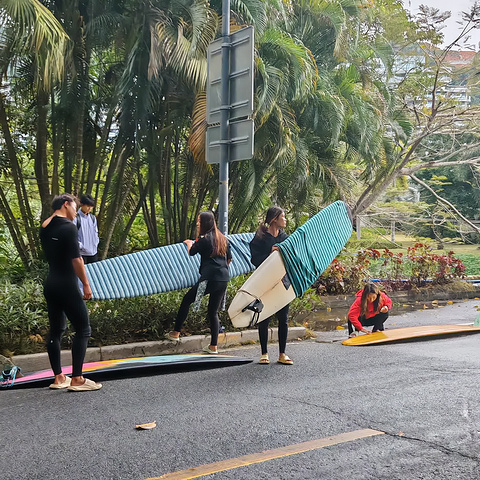 走到通往海边的那条林间小路的路口时,我看到从一个大巴车上下来几个年轻人,他们每人抱着一块冲浪板,顺着小路向海边走去。他们都穿着紧身的泳衣,个个皮肤黝黑、身体精瘦结实,一看就是专业冲浪人员。我问他们今天冲浪是不是有点冷,他们说还可以,运动起来不会觉得怎么冷。我看了一眼大巴车上的文字,原来他们都是国家冲浪运动员。