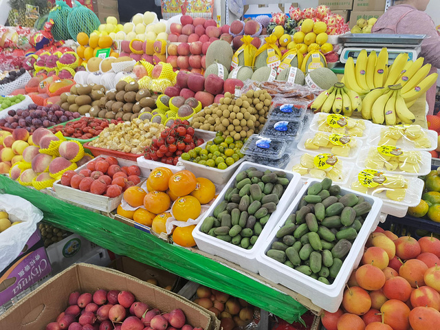 从水上市场步行约700米(10分钟)就到了西市场——延吉最大的综合性室内集贸市场,西市场在一栋大楼里,室内有暖气,逛起来很舒服。一楼主打食品特产、水果、海鲜水产和蔬菜,我们在那儿买了姑娘果,酸甜可口,特别好吃;二楼是干货、日用品和服装鞋帽,我买了套泡泡棉睡衣,柔软又舒服;三楼主要是批发商品、民族服饰和工艺品等。那里有一家92岁老奶奶的手工布包摊,可惜我们快九点到时她已收摊回家,只剩三个孤零零的布包,做工还蛮精致的,只要16元,由隔壁摊主代卖。我们随便逛了逛,各自买了些小纪念品,便回酒店了。
