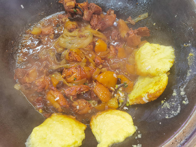 第一站是本地人推荐的铁锅炖店——“二姐柴火地锅鸡”。五点多到店时,老板一见我们就问有没有预约,桌子早已被订满。我们本以为早点去就能吃上,却忘了铁锅炖至少要炖40分钟,根本没法随到随吃。无奈之下,赶紧在团购平台上另找一家店,电话联系后,老板建议我们立刻在某团下单核销,他可以先帮我们把菜炖上,等我们赶到后稍等片刻就能开吃。