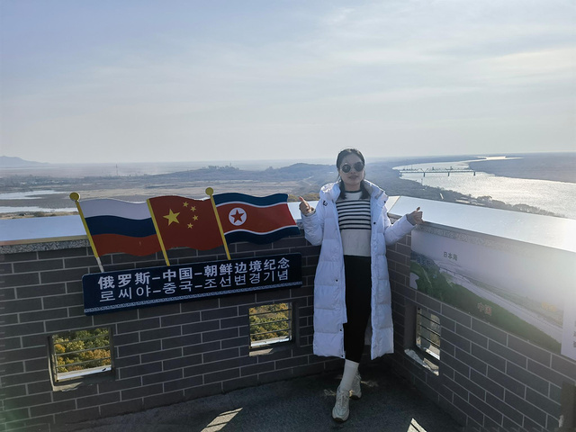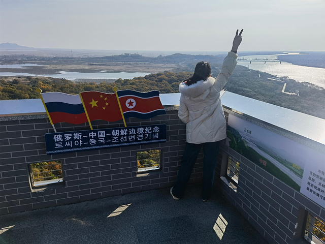 防川风景区门票70元,另需乘坐7元的景区接驳车进入核心区。核心观景点是龙虎阁——一座13层高的仿古塔式建筑,也是整个景区的制高点。登上龙虎阁观景台,左手是中国珲春敬信镇,眼前是蜿蜒入海的图们江,对岸是朝鲜豆满江市的村落,而左侧远处则属于俄罗斯滨海边疆区的哈桑镇,远处能望见日本海——真正实现“一眼望三国,远眺日本海”。这个被誉为“一眼望三国”的景区,距离市区单程约65公里,公共交通极为不便,去景区几乎只能靠包车。头天在珲春高铁站打车时,司机就主动问我们要不要第二天包车,价格谈妥后,约好第二天出发。