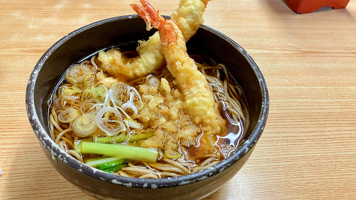 长野下伊那郡阿智村当地比较有名的荞麦面店,中午到下午营业晚上不开,去的时候快关门了但还坐满了人。店门口有许多当地特产卖。荞麦比例是十割的,比较有名的是三人份的巨大量套餐(摊开有三个手掌大小)。荞麦面吃法一般分为冷热两种,热的类似拉面泡在热汤里有点配菜;冷的面放在箩筐里蘸单独的汤汁吃,不同的店蘸汁也是冷热不一。这家面的口感有一点韧弹还不错,汤味道偏浓厚。