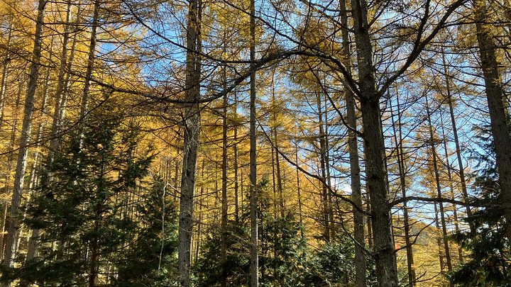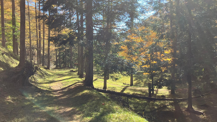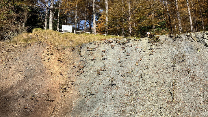 北川露头,可能指的是川(也就是小河)北侧的露头,露头是一种地质结构,涉及地层、矿产等地质特征的自然暴露区域。这里地处中央构造线(西南日本贯穿本州至九州的大型活动断裂带),这个露头可以看到两种岩层的交界,发黄的是花岗岩,绿黑色是结晶片岩。这个露头从景色角度看点不足,但是这里一片高大的落叶针叶林非常漂亮,偶尔还夹杂一颗枫树,林间道路是铺满青苔和落叶的原始土路,特别松软,很少有人工的痕迹。在这里徒步是一种能够享受。