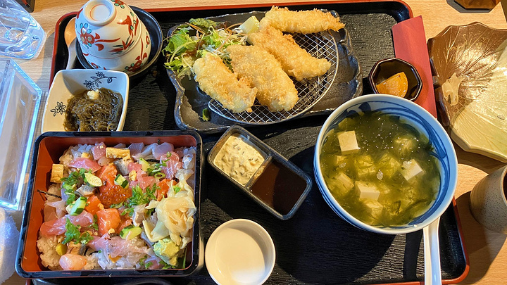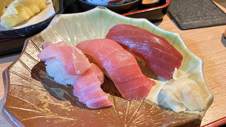 当地平价鱼料理食堂,这家应该是本店,交通不太方便,最近的轻轨是北侧的,要走15min,而且如果不是顺路不建议来这家,而是去渡轮港口的那家店。本店几乎都是定食形式,有少量的寿司可以单点(没有20贯套餐)。定食中规中矩,没什么特别的亮点,点了金枪鱼三个部位的寿司简直拉跨就是垃圾,舍利是干硬的失水了怀疑放了一周,鱼肉的品质也不咋地,完全是糊弄事,这家鱼的质量匪夷所思的比港口的那家要差。