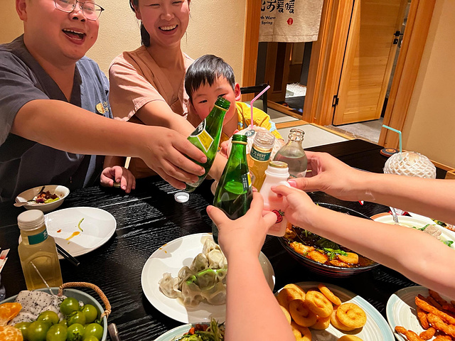 我们包了一个私汤,1000元,包含四个大人门票,还有一晚住宿,私汤是只有一个房间,但是外面客厅是榻榻米,提供了我们4个床铺,结果两家人都打地铺了,爸爸们怕打呼,先去了公区,后来又回来了。