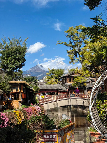 白天逛特别舒服:去忠义夜市附近,抬头能看见雪山尖儿躲在蓝天里,古城屋顶、路边的花、远处的雪,凑在-起就是我心里丽江该有的样子;四方街也建议去,水流清澈,花团锦簇。