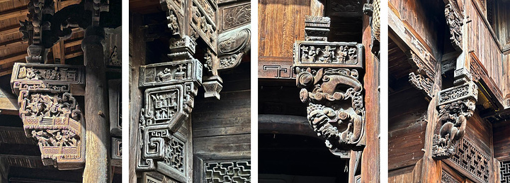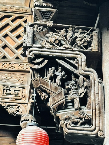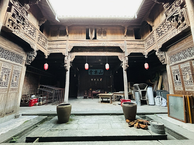 砚池旁边的山乐堂开着门,进去发现里面装饰好美呀,满眼精致绝仑的木雕,简直靓瞎眼了。窗棂、雀替、牛腿等均是精雕细琢,巧夺天工,那些木质的纹理与雕刻的线条相互交织,美得让人无语,仿佛置身于一幅流动的画卷之中、木雕的海洋之中,真是醉了。