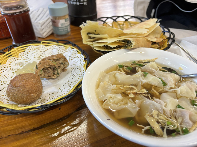 休息到3:00才出门,先找吃的,古镇有著名的龙门面筋,是用小麦粉多次洗淘后作为皮儿,再包上肉竹笋馅子进油锅炸成的,非常好吃。出门就进了对面一家小店,要了一个煎饼、一碗小馄饨,2个面筋,都很好吃。