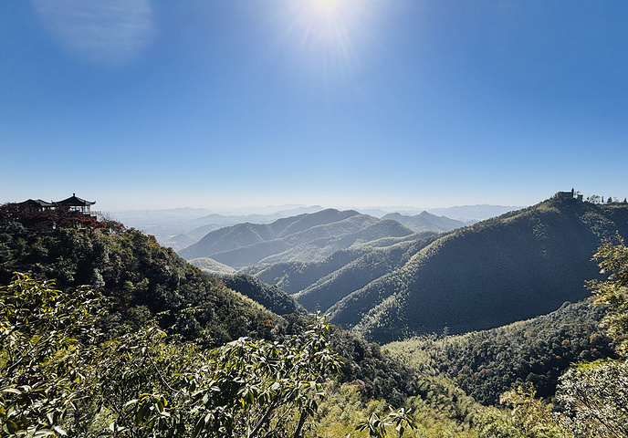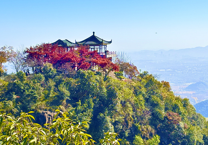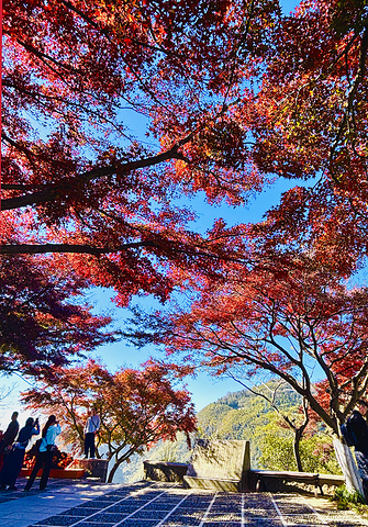 清凉亭-旭光台,这里风景很好,下车欣赏不远处小山顶的旭光台很美。穿过清凉亭走一小段台阶就到了,旭光台不仅远观美,近赏也很漂亮,亭前有一片红枫,艳艳的颜色泛着耀眼的光芒,每个角度都是极好的机位。还可以俯瞰竹海全景。