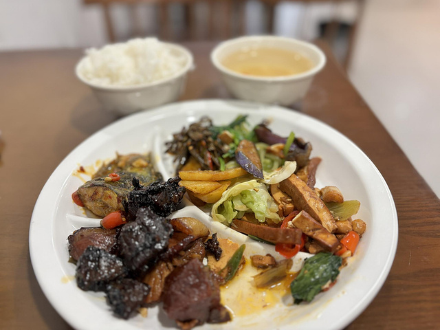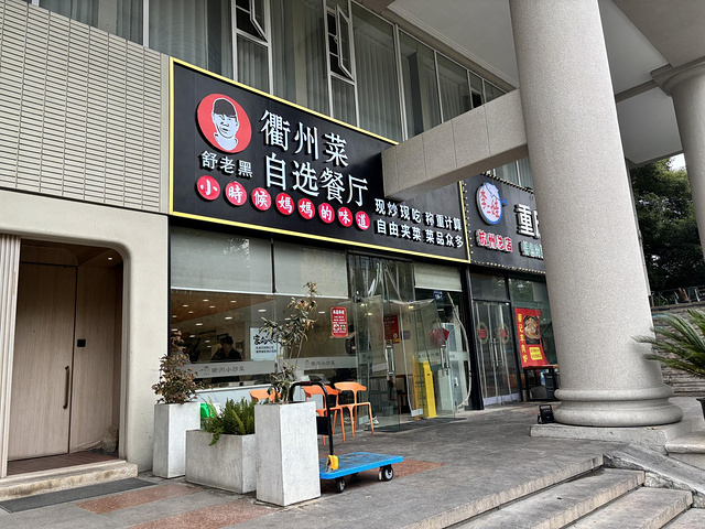 从杭州东站下车乘地铁,出地铁打个车去天目路酒店,到楼下就看见了自助快餐,赶紧进去吃吧,肚子已饿了。这家的菜品较多,且都炒得很香,拿了小炒肉、一块鱼,五六种青菜才23元,真是物美价廉,吃得很好,每次吃一顿这样的全面饭菜,都感觉好舒服满足。