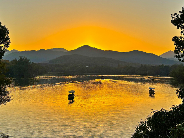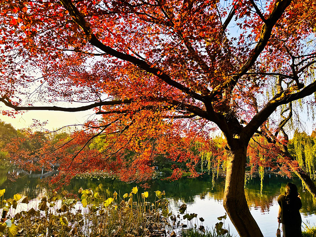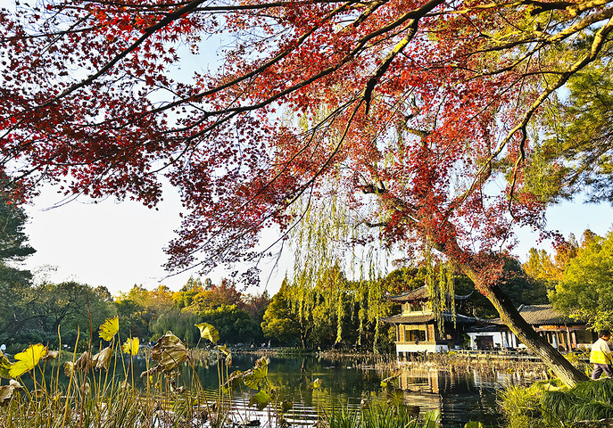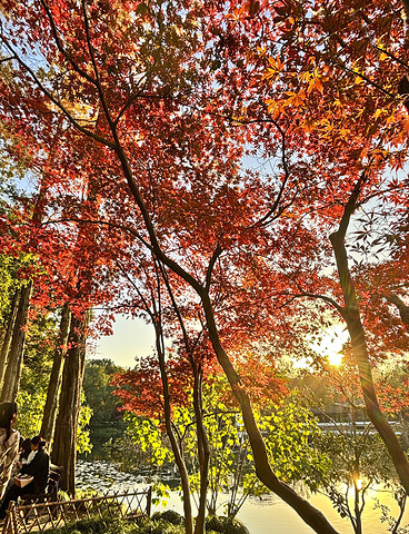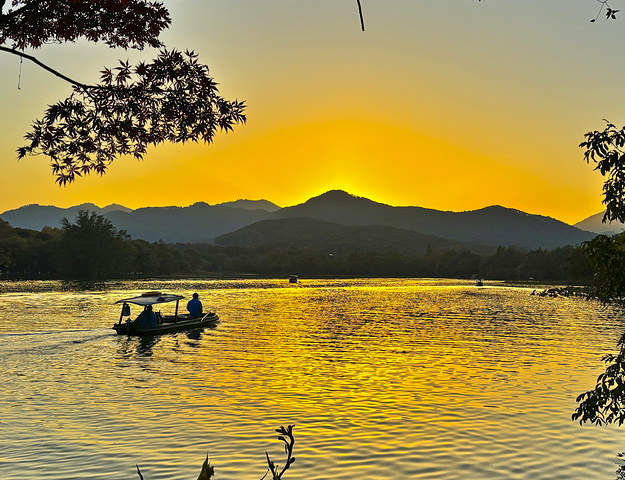 出来沿杨公堤走走,呀!路边有大片红叶。杨公堤上还有公交车,坐到郭庄下来,5:00关门了。向前走一点是茅家埠景区,夕阳正要落山,染红了整个湖面,还有不时划过的小船,那是一种宁静而又热烈的美,让人陶醉其中,流连忘返。
