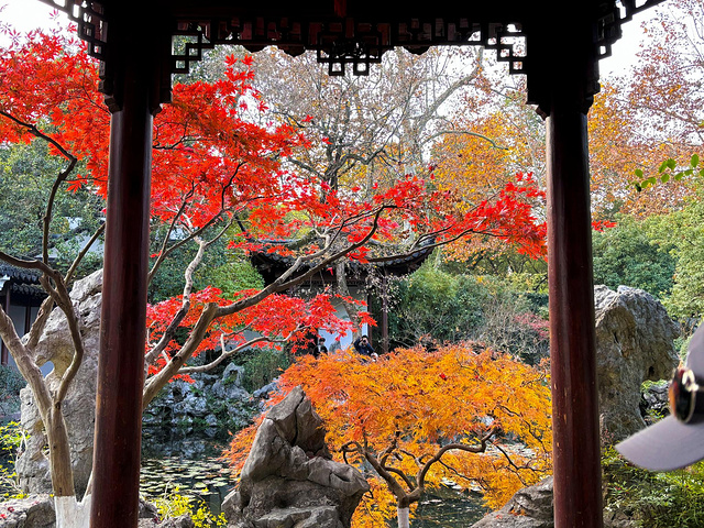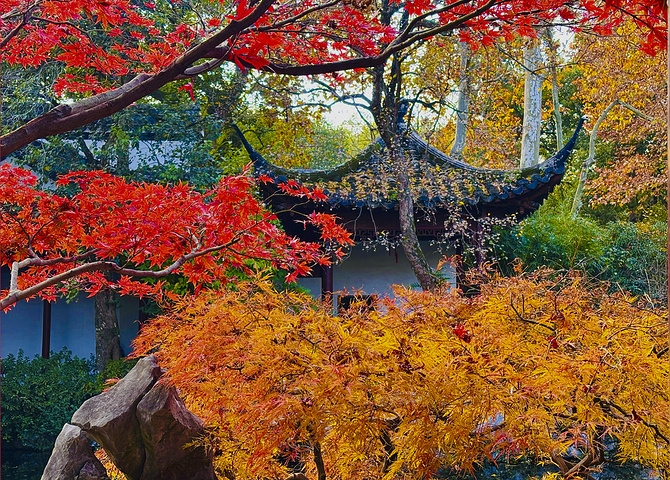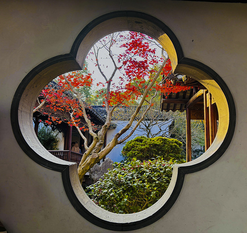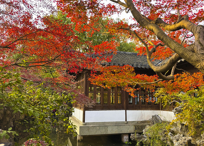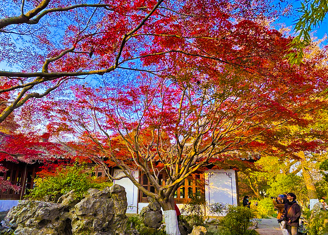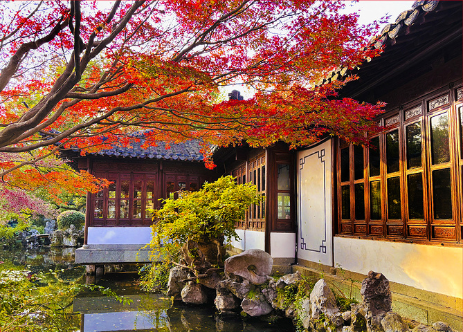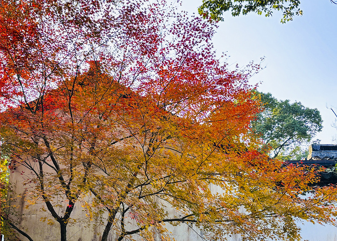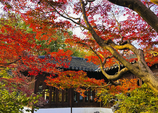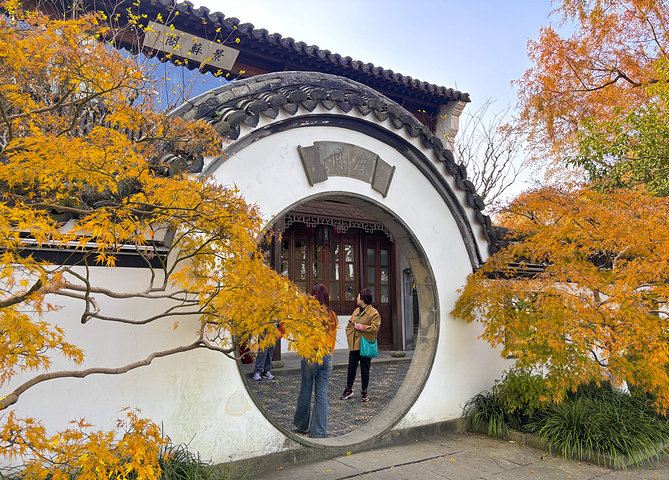 天儿基本放晴了,小园林不大但枫叶与古老建筑的结合非常美,好多角度都是经典画面。红枫在白墙黛瓦的衬托下,显得格外婉约,转角处的漏窗框住一片火红,仿佛框住了整个秋天的浪漫。我在里面转了两圈,拍了好多照片,感觉杭州最最经典的秋色就在郭庄里面。来自游记【杭州】寻秋七日,满目枫红满目诗(攻略游记)